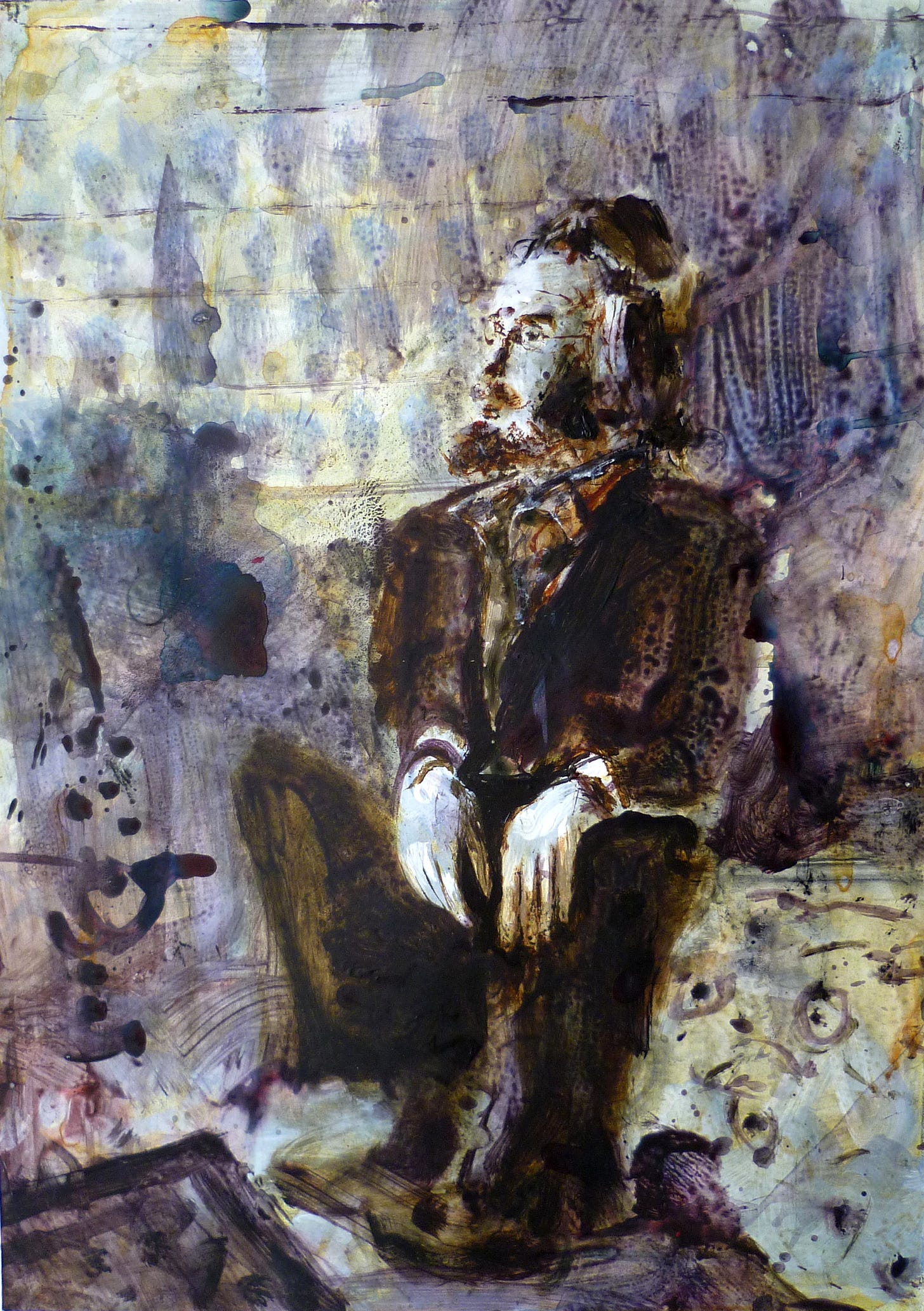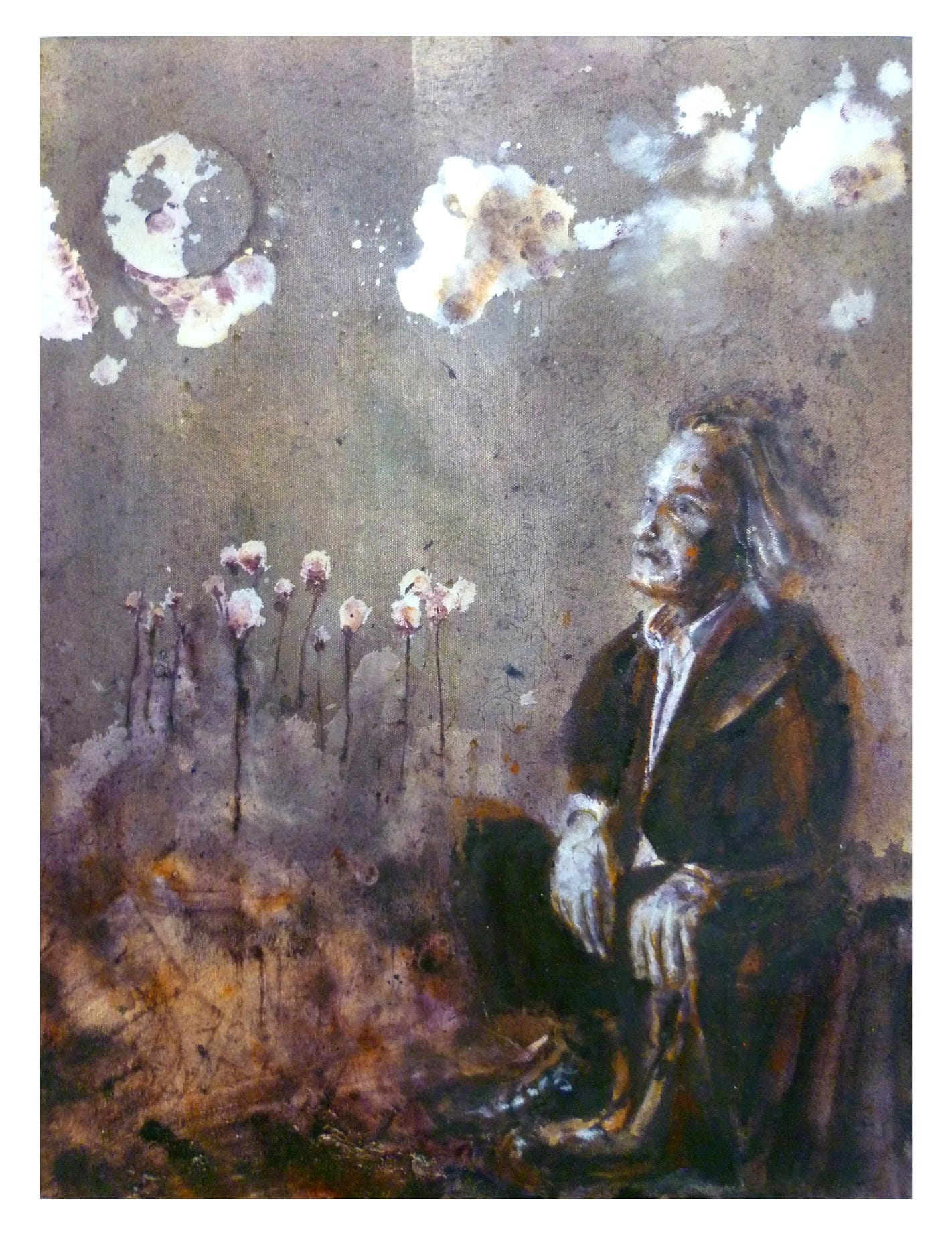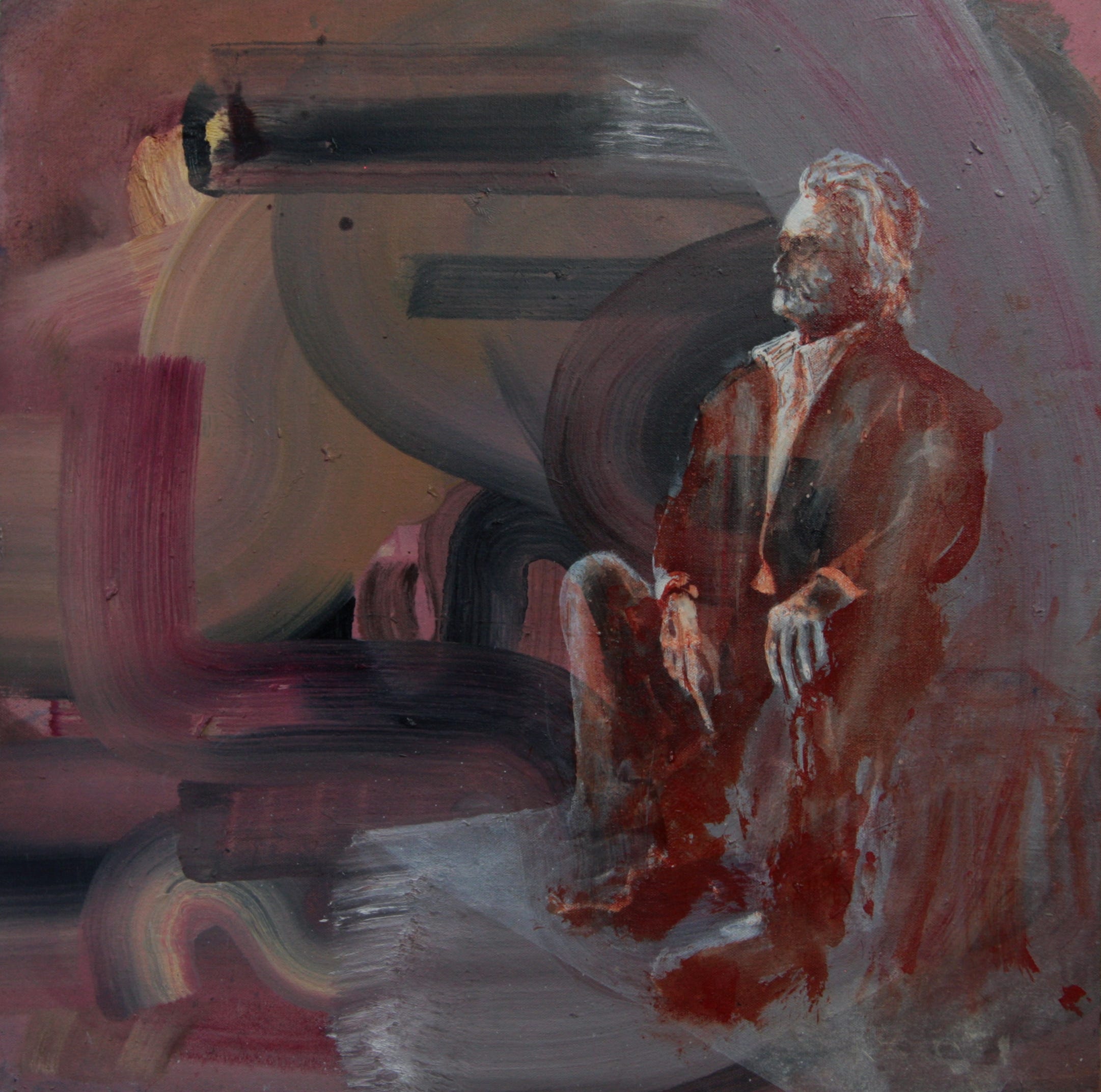 These three paintings arose sequentially. The first was an outline, a basis, loose, free and dandyish. The second is heavier - darker, melancholic, romantic and nocturnal. The third is light and cerebral, abstract and modern, the protagonist looking like a rusty spectre - less permanent than the space he occupies.